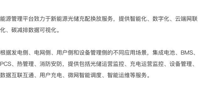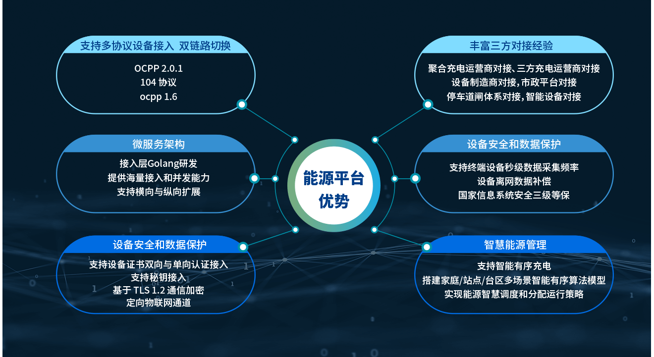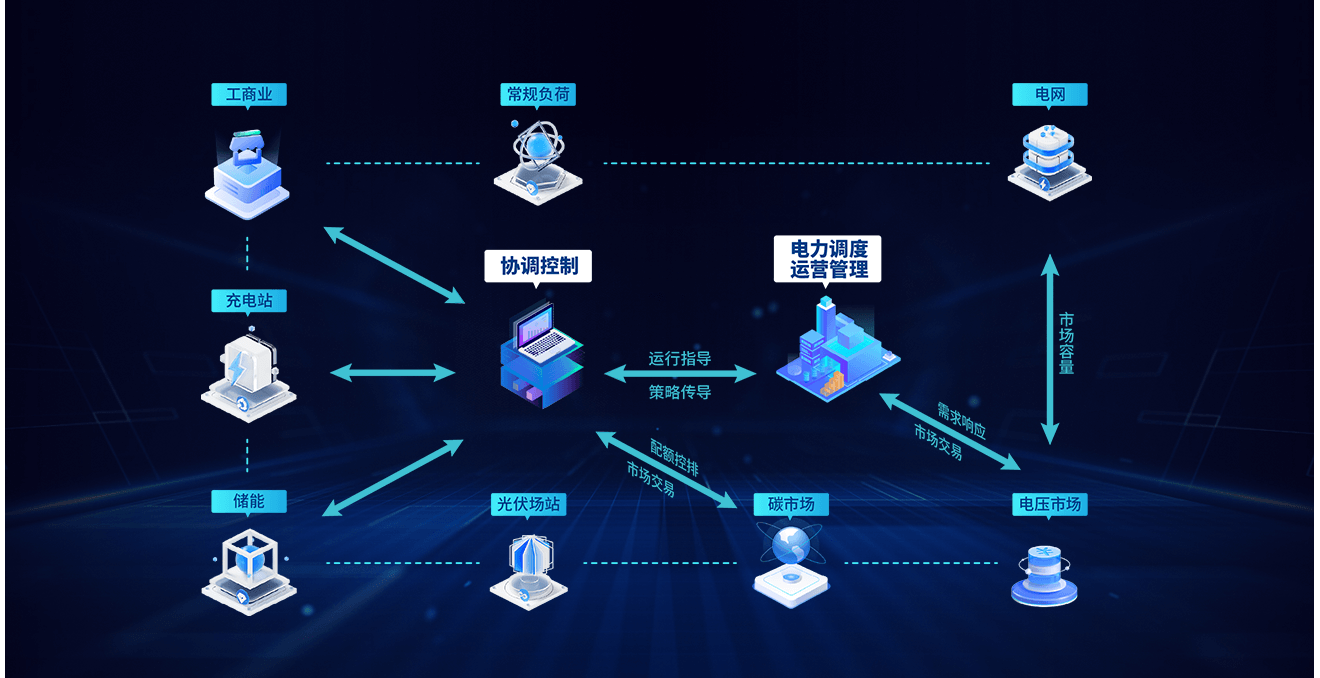 均悦充依托充配电、光储产业链资源及多年的科研实力和项目经验。基于微服务底层架构,自主开发充电运维管理平台、智能充电运营管理平台、终端管理平台, 实现了新能源发电装置、储能系统、电动汽车、充电站、换电站等DER(分布式能源资源)的聚合和协调优化。 等效形成了一个可控电源,辅助国家电力系统运行,参与电力市场交易,同时优化能源网络,实现智能化、可视化、数据化的“削峰填谷”, 保证区域内及跨区域的用电稳定和用电安全。